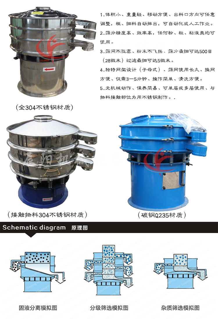 旋振篩由直立式振動(dòng)電機(jī)、普通電機(jī)拖動(dòng)激振器兩種振動(dòng)方式,振動(dòng)源上下兩端安裝有偏心重錘。下兩端重錘,配置不同,激振源在旋轉(zhuǎn)時(shí),產(chǎn)生水平、垂直、傾斜的三次元運(yùn)動(dòng),再把這個(gè)運(yùn)動(dòng)傳遞給篩面。調(diào)節(jié)上、下兩端的相位角,可以改變物料在篩面上的運(yùn)動(dòng)軌跡,達(dá)到精細(xì)篩分、除雜、過濾 的目的。